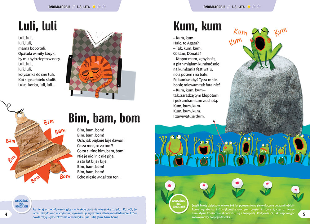 Trzeba przyznaæ, ¿e niektóre ze wspomnianych porad dla rodziców s± bardzo kreatywne! Z pewno¶ci± podsun± Wam kilka pomys³ów na ciekawe zabawy logopedyczne, które mo¿na realizowaæ z dzieckiem w domu, na spacerze, w trakcie czynno¶ci pielêgnacyjnych, masa¿yków czy innych rodzinnych rytua³ów (...) Dodatkowym atutem ksi±¿ki s± te¿ zabawne ilustracje Artura Gulewicza - bardzo kolorowe i charakterystyczne, zachêcaj±ce dziecko do rozmów na temat wierszy oraz opowiadania o tym, co mo¿na dostrzec na obrazku. Wszystko to razem wziête sprawia, ¿e ksi±¿eczka ma niezwykle aktywizuj±cy charakter (...)