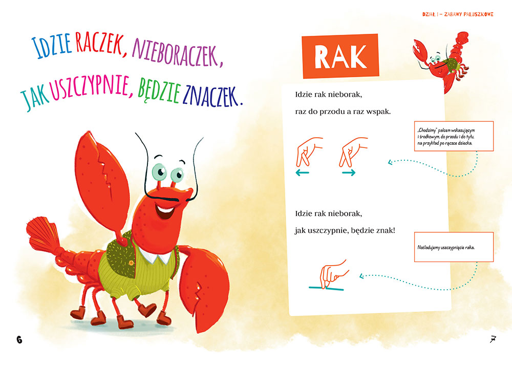 Zabawy paluszkowe zawierają takie rymowanki jak Idzie rak nieborak..., Sroczka kaszkę warzyła, Idzie kominiarz po drabinie... czy Tańcowały dwa Michały. To bardzo znane utwory będące częścią polskiej kultury, bez których trudno wyobrazić sobie dzieciństwo. Każdej rymowance towarzyszą nie tylko kolorowe ilustracje, ale również czytelne schematy dłoni wraz z komentarzami, które dokładnie wyjaśnią, ja należy się bawić, by wykorzystać w stu procentach potencjał rymowanki. Są to oczywiście jedynie sugestie dla czytającego - możliwości zabawy są nieskończone!