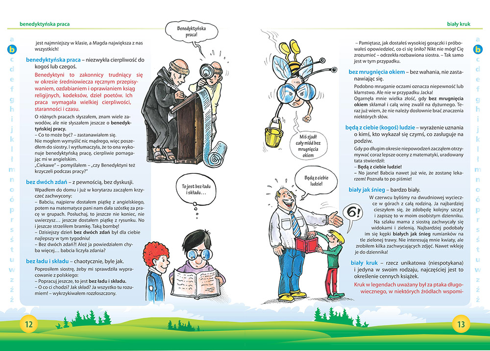 Zaradziæ temu mo¿e Ilustrowany s³ownik frazeologiczny, który powsta³ z my¶l± o uczniach szko³y podstawowej i ka¿dym, kto lubi dowiadywaæ siê nowych rzeczy, dobrze siê przy tym bawi±c. Obszerny zbiór zwi±zków frazeologicznych zawiera wszystkie najpopularniejsze zwi±zki, ale równie¿ te ma³o znane, ale szalenie ciekawe. Wyt³umaczone zosta³y w prosty i przystêpny sposób, do tego ka¿de has³o zawiera krótk± opowiastkê, ilustruj±c±, wyja¶niaj±c± dany frazeologizm. To humorystyczne, zabawne historyjki z ¿ycia uczniów, od których nie mo¿na siê oderwaæ. Dziêki temu s³ownik czyta siê jak najlepsz± ksi±¿kê.
