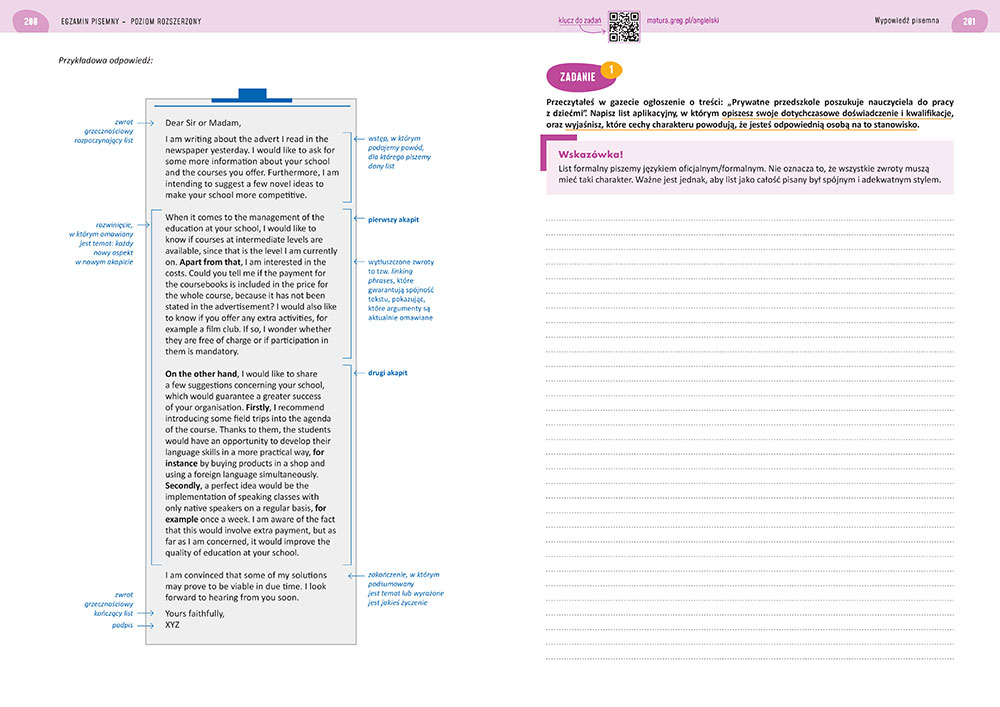 Co jako rodzice, nauczyciele, przyjaciele mo¿emy poleciæ naszym maturzystom? Otó¿, niedawno Wydawnictwo GREG, pod redakcj± pani Agnieszki Antosiewicz, autorstwa Danieli Maclsaac i Bogus³awa Soleckiego wyda³o rewelacyjnie przygotowan± pomoc „Matura. Jêzyk angielski. Poziom podstawowy i rozszerzony” – podrêcznik, skierowany do uczniów klas maturalnych, ale moim zdaniem i nie tylko. Mo¿e on byæ tak¿e wykorzystany przez osoby, które chc± pog³êbiæ, sprawdziæ i utrwaliæ swoj± wiedzê (...) Uczeñ dostaje do rêki bardzo rzetelnie przygotowany materia³. Ponad trzysta stron zadañ, tekstów, komentarzy. I co jest bardzo wa¿ne i nale¿y to wyra¼nie podkre¶liæ, podrêcznik jest przygotowany do matury w 2023 roku, w której zajd± pewne zmiany (...) To co wyró¿nia podrêcznik „Matura. Jêzyk angielski. Poziom podstawowy i rozszerzony” wydawnictwa GREG od innych - mo¿e podobnych, na rynku, to to ¿e na ka¿dej stronie znajdziemy klucz odpowiedzi do zadañ. Bez problemu otworzymy go za pomoc± klucza QR. Dziesi±tki zadañ – ró¿nego typu, mnóstwo tekstów, ciekawych pomocnych zdjêæ, ilustracji, jasny, przejrzysty tekst. Ca³o¶æ przemy¶lana i bardzo dobrze przygotowana – oto moim zdaniem najlepsza pomoc dla ka¿dego maturzysty, zdaj±cego egzamin z jêzyka angielskiego.