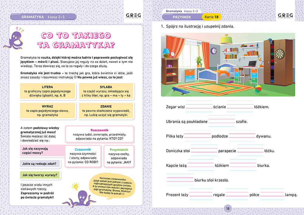Gramatyka. Karty pracy dla klas 2-3 to zestaw æwiczeñ z gramatyki - od podzia³u na sylaby do zdañ z³o¿onych. Ró¿norodnym zadaniom towarzysz± regu³y i wskazówki, które sprawi±, ¿e gramatyka nie bêdzie mia³a tajemnic. Ka¿d± kartê mo¿na wyrwaæ i rozwi±zaæ w domu lub skserowaæ w czerni i bieli i rozdaæ dzieciom podczas zajêæ w szkole.