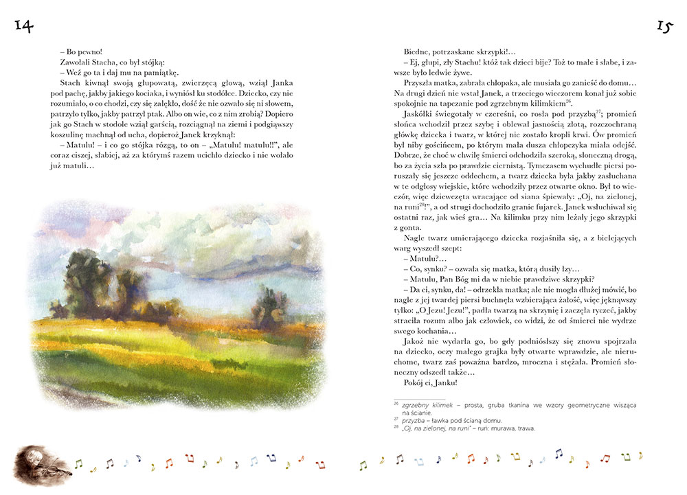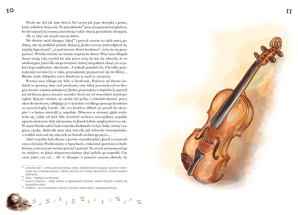 Bohater tej nowelki, Janko, to biedny wiejski chłopiec, który ma ogromny dar - talent muzyczny. Dziecko słyszy muzykę wszędzie, nawet w szumie wiatru i szeleście liści, a jego największym marzeniem jest posiadanie własnych skrzypiec. Niestety uboga wieś, na której żyje, nie rozumie tego i nie popiera, uważając chłopca za nieprzydatnego do niczego dziwaka... A wszystko to dzieje się tuż obok majątku szlacheckiego, którego mieszkańcy zachwycają się talentami włoskich dzieci.