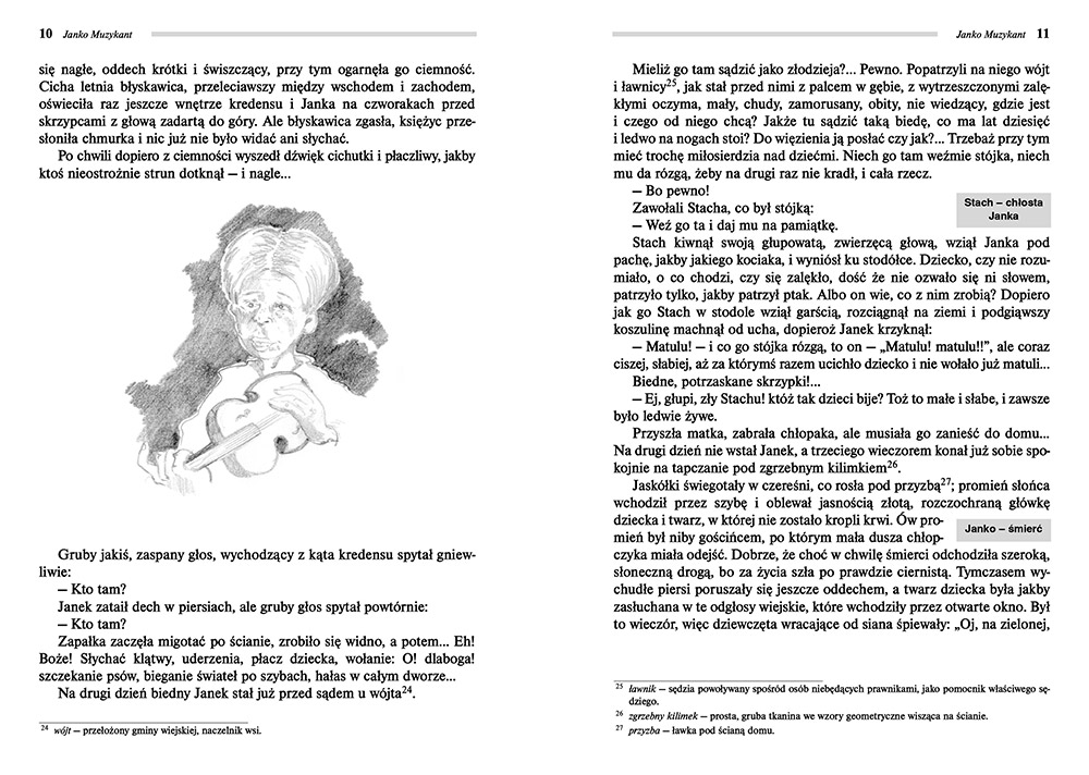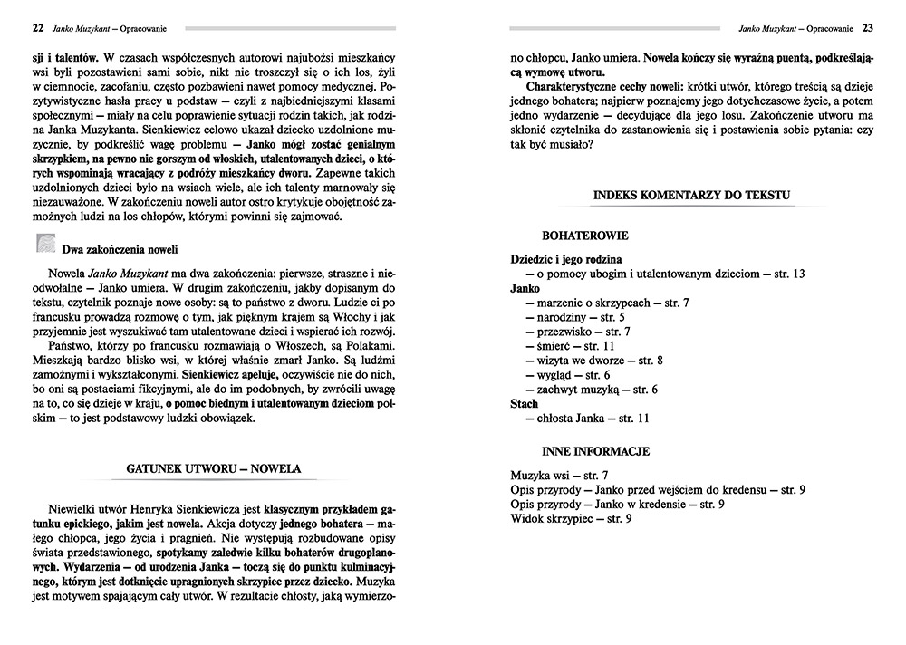 Wydanie Janka Muzykanta kompletne bez skrótów i cięć w treści. W tym wydaniu znajdziesz odpowiedzi na pytania z podręcznika - „pewniak na teście”, czyli wskazanie zagadnień, które zwykle pojawiają się w pytaniach z danej lektury we wszelkich testach sprawdzających wiedzę, a także w podręcznikach i na klasówkach. Książka zawiera pełen tekst lektury. Na końcu książki zamieszczono opracowanie, w którym znajduje się bardzo szczegółowe streszczenie oraz drugie skrócone, ułatwiające szybkie przygotowanie się przed lekcją. Opracowanie zawiera ponadto plan wydarzeń, wnikliwie wyjaśnioną problematykę oraz szerokie charakterystyki bohaterów.