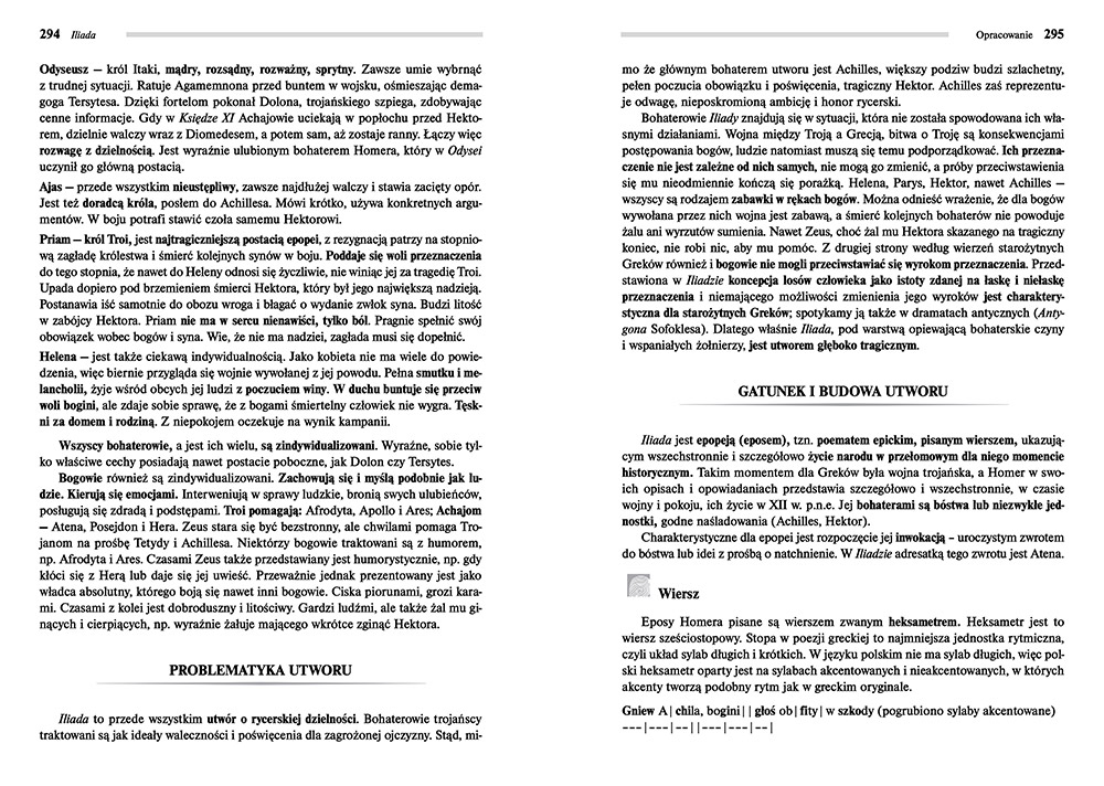 Wydanie Iliady kompletne bez skrótów i cięć w treści. W tym wydaniu znajdziesz odpowiedzi na pytania z podręcznika - „pewniak na teście”, czyli wskazanie zagadnień, które zwykle pojawiają się w pytaniach z danej lektury we wszelkich testach sprawdzających wiedzę, a także w podręcznikach i na klasówkach. Książka zawiera pełen tekst lektury. Na końcu książki zamieszczono opracowanie, w którym znajduje się bardzo szczegółowe streszczenie oraz drugie skrócone, ułatwiające szybkie przygotowanie się przed lekcją. Opracowanie zawiera ponadto plan wydarzeń, wnikliwie wyjaśnioną problematykę oraz szerokie charakterystyki bohaterów.