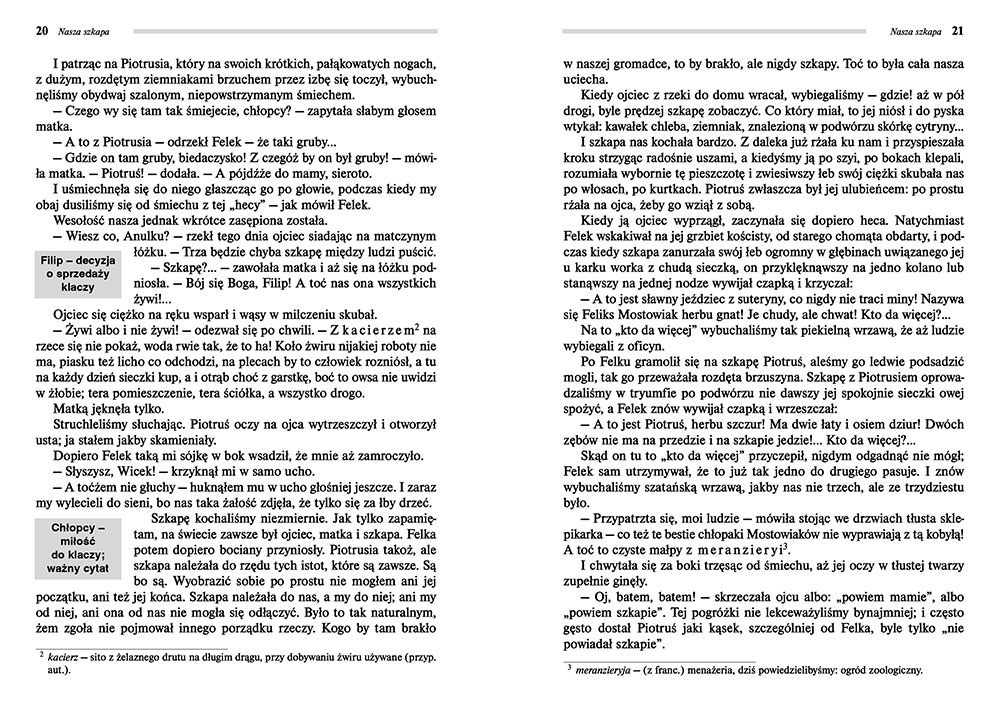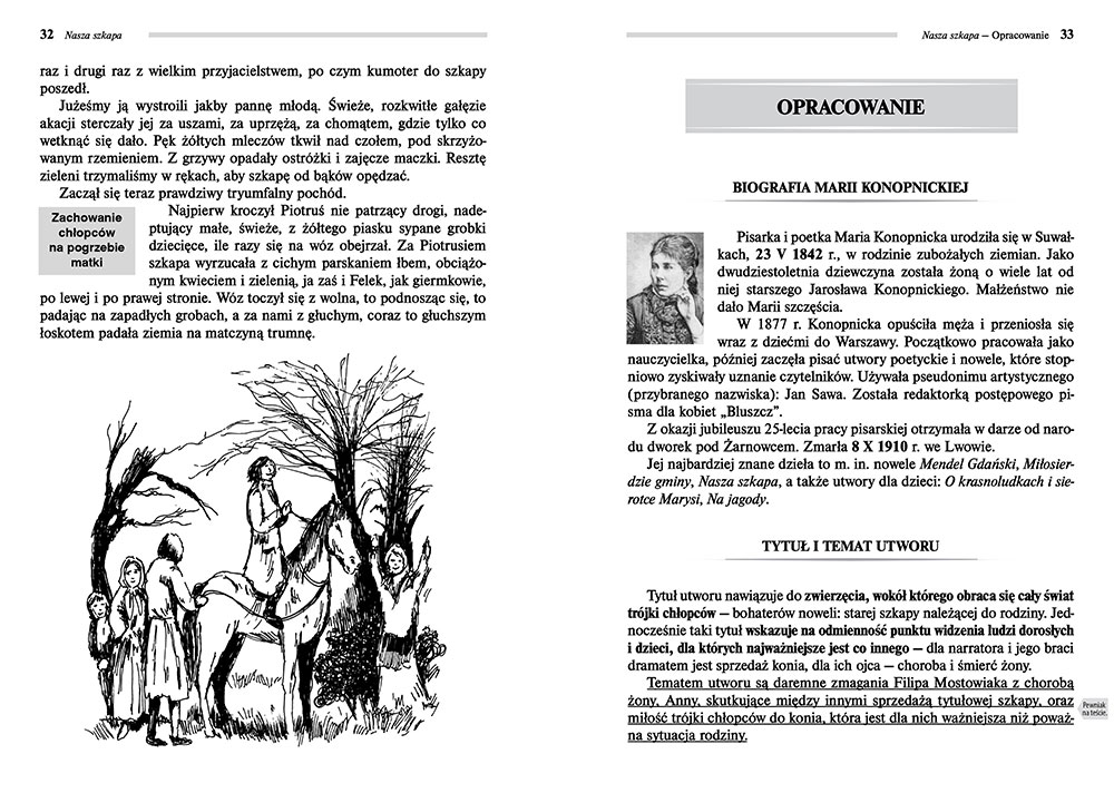Wydanie Naszej szkapy kompletne bez skrótów i cięć w treści. W tym wydaniu znajdziesz odpowiedzi na pytania z podręcznika - „pewniak na teście”, czyli wskazanie zagadnień, które zwykle pojawiają się w pytaniach z danej lektury we wszelkich testach sprawdzających wiedzę, a także w podręcznikach i na klasówkach. Książka zawiera pełen tekst lektury. Na końcu książki zamieszczono opracowanie, w którym znajduje się bardzo szczegółowe streszczenie oraz drugie skrócone, ułatwiające szybkie przygotowanie się przed lekcją. Opracowanie zawiera ponadto plan wydarzeń, wnikliwie wyjaśnioną problematykę oraz szerokie charakterystyki bohaterów.