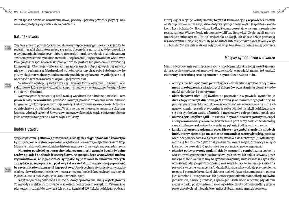 "Syzyfowe prace" to trudna lektura, którą jednak warto przeczytać. Poznajemy historię ucznia Marcina Borowicza, obraz szkoły w rosyjskim Królestwie Polskim i walkę polskiej młodzieży z rusyfikacją. Książka opisuje ducha narodu, którego żaden zaborca nie mógł stłamsić.