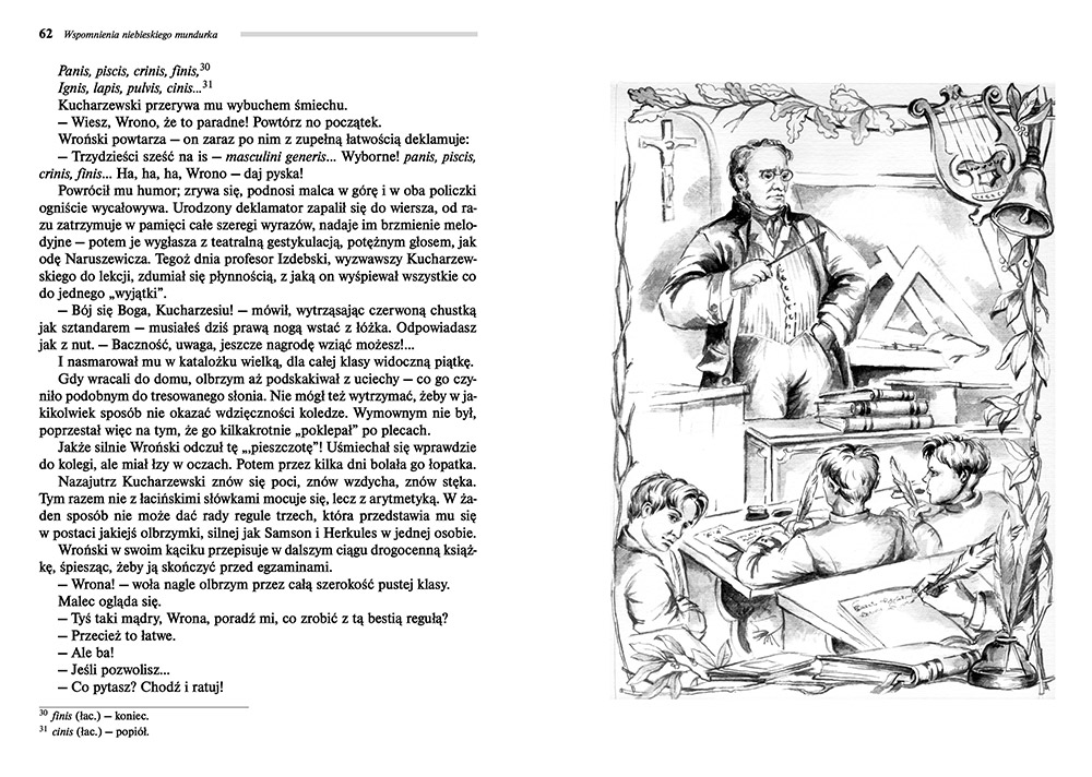 Główny bohater - Witold Sprężycki jest uczniem szkoły w Pułtusku. Wraz ze swoimi kolegami: Dembowskim, Hefajstosem, Konopką, Zabacułem, Kuchrzewskim i innymi przeżywają szkolne wzloty i upadki. Chłopcy mają różne zainteresowania i zdolności - jeden pięknie kaligrafuje, inny wykonuje doskonałe rysunki, ostrzy pióra czy wykonuje niebezpieczne skoki do wody. Dzięki tej książce poznajemy życie młodych chłopców z drugiej połowy XIX wieku.