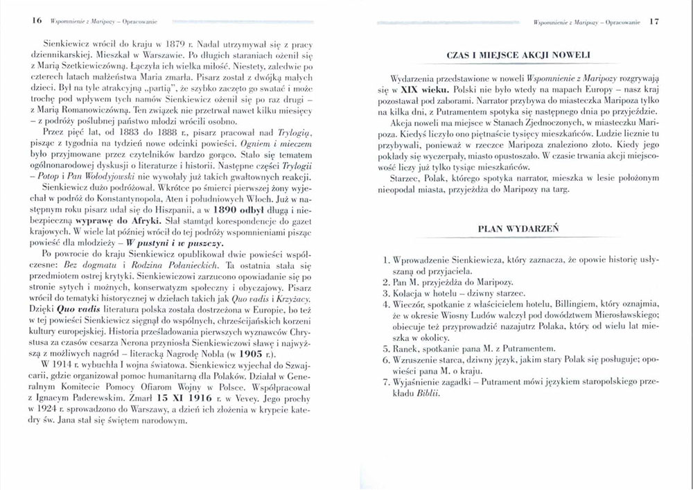 Wydanie Wspomnienia z Maripozy kompletne bez skrótów i cięć w treści. W tym wydaniu znajdziesz odpowiedzi na pytania z podręcznika - „pewniak na teście”, czyli wskazanie zagadnień, które zwykle pojawiają się w pytaniach z danej lektury we wszelkich testach sprawdzających wiedzę, a także w podręcznikach i na klasówkach. Książka zawiera pełen tekst lektury. Na końcu książki zamieszczono opracowanie, w którym znajduje się bardzo szczegółowe streszczenie oraz drugie skrócone, ułatwiające szybkie przygotowanie się przed lekcją. Opracowanie zawiera ponadto plan wydarzeń, wnikliwie wyjaśnioną problematykę oraz szerokie charakterystyki bohaterów.