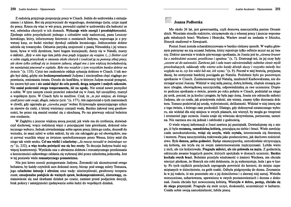 Wydanie Ludzi bezdomnych kompletne bez skrótów i cięć w treści. W tym wydaniu znajdziesz odpowiedzi na pytania z podręcznika - „pewniak na teście”, czyli wskazanie zagadnień, które zwykle pojawiają się w pytaniach z danej lektury we wszelkich testach sprawdzających wiedzę, a także w podręcznikach i na klasówkach. Książka zawiera pełen tekst lektury. Na końcu książki zamieszczono opracowanie, w którym znajduje się bardzo szczegółowe streszczenie oraz drugie skrócone, ułatwiające szybkie przygotowanie się przed lekcją. Opracowanie zawiera ponadto plan wydarzeń, wnikliwie wyjaśnioną problematykę oraz szerokie charakterystyki bohaterów.