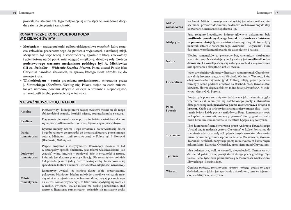 Obejmuje wszystkie lektury obowiązujące z zakresu podstawowego, które będą wymagane na sprawdzianach oraz na maturze z języka polskiego. Każda z lektur została dokładnie omówiona, zawiera streszczenia i problematykę, spis bohaterów, a całość uzupełniają notki biograficzne autorów. Ponadto zamieszczono w niej analizy i interpretacje wymaganych na języku polskim wierszy oraz omówiono cechy charakterystyczne każdej epoki literackiej. W części drugiej, zgodnie z programem szkolnym, omówiono epoki Romantyzmu i Pozytywizmu.